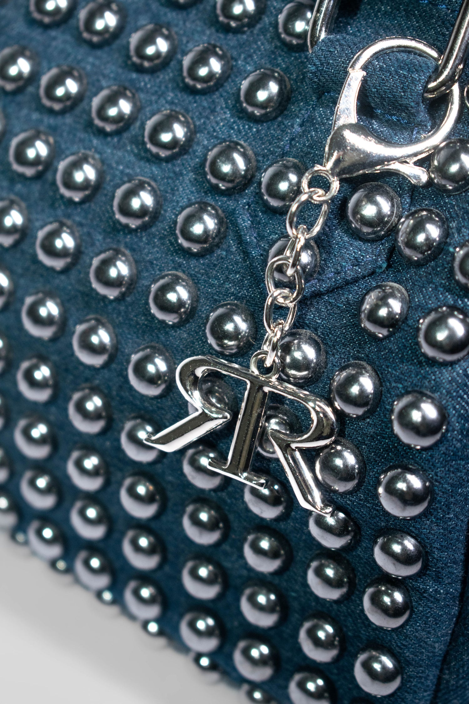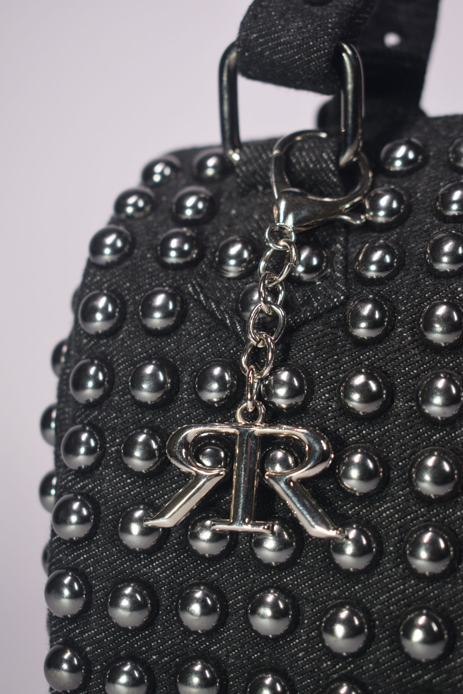 Studded Barrel Bag - Designer handbags for that urban look, made to look chic on any outfit. This bag has ample space because of its structure, while remaining compact. These embellished denim bags can be dressed down or dressed up.
